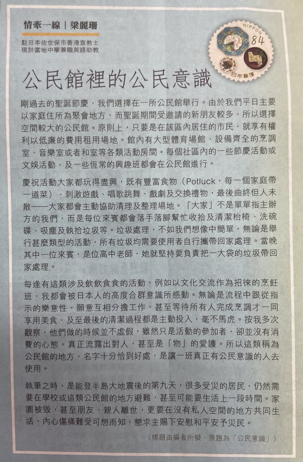 隨筆《公民館裡的公民意識》 Post author:Lai Shan Leung Post published:2024-02-28 Post category:隨筆 Post comments:0 Comments *本文於《時代論壇》(2024年1月19日)刊登 Views : 8 Tags: 時代論壇 Please Share This Share this content Opens in a new window Opens in a new window Opens in a new window Opens in a new window Opens in a new window Opens in a new window Opens in a new window Opens in a new window Opens in a new window Opens in a new window Read more articles Previous Post隨筆《學海無涯》Next Post隨筆《港日禮儀大不同》 You Might Also Like 隨筆:小店情懷 2021-12-10 隨筆《修學旅行之禮》 2023-11-13 5月5日宣教分享@hahahappy.p (一間滿載人情味的小店) 2024-05-05 Leave a Reply Cancel replyCommentEnter your name or username to comment Enter your email address to comment Enter your website URL (optional) Save my name, email, and website in this browser for the next time I comment. Δ