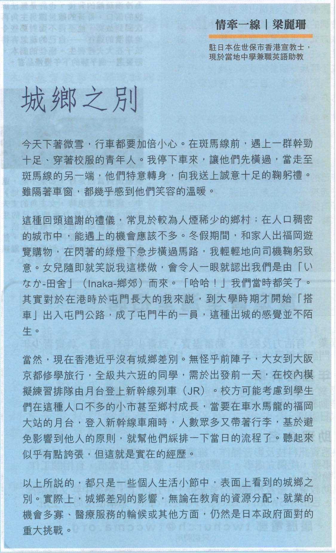 隨筆《城鄉之別》 Post author:Lai Shan Leung Post published:2023-03-24 Post category:隨筆 Post comments:0 Comments *本文於《時代論壇》(2023年2月24日)刊登 Views : 5 Tags: 時代論壇 Please Share This Share this content Opens in a new window Opens in a new window Opens in a new window Opens in a new window Opens in a new window Opens in a new window Opens in a new window Opens in a new window Opens in a new window Opens in a new window Read more articles Previous Post市街上的萬聖節Next Post隨筆《挨拶見面禮》 You Might Also Like 短宣隊的祝福 2024-10-14 隨筆《青年人的人生進路》 2024-07-28 隨筆《日本退休白髮勞動力》 2023-10-08 Leave a Reply Cancel replyCommentEnter your name or username to comment Enter your email address to comment Enter your website URL (optional) Save my name, email, and website in this browser for the next time I comment. Δ