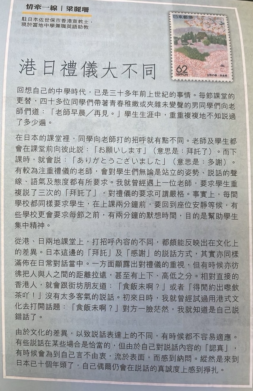 隨筆《港日禮儀大不同》 Post author:Lai Shan Leung Post published:2024-04-08 Post category:隨筆 Post comments:0 Comments *本文於《時代論壇》(2024年3月8日)刊登 Views : 4 Tags: 時代論壇 Please Share This Share this content Opens in a new window Opens in a new window Opens in a new window Opens in a new window Opens in a new window Opens in a new window Opens in a new window Opens in a new window Opens in a new window Opens in a new window Read more articles Previous Post隨筆《公民館裡的公民意識》Next Post隨筆《日本人的安全感》 You Might Also Like 隨筆《視野》 2023-07-23 隨筆:回看與整理 2021-11-25 隨筆:對不起/抱歉文化 2021-10-25 Leave a Reply Cancel replyCommentEnter your name or username to comment Enter your email address to comment Enter your website URL (optional) Save my name, email, and website in this browser for the next time I comment. Δ