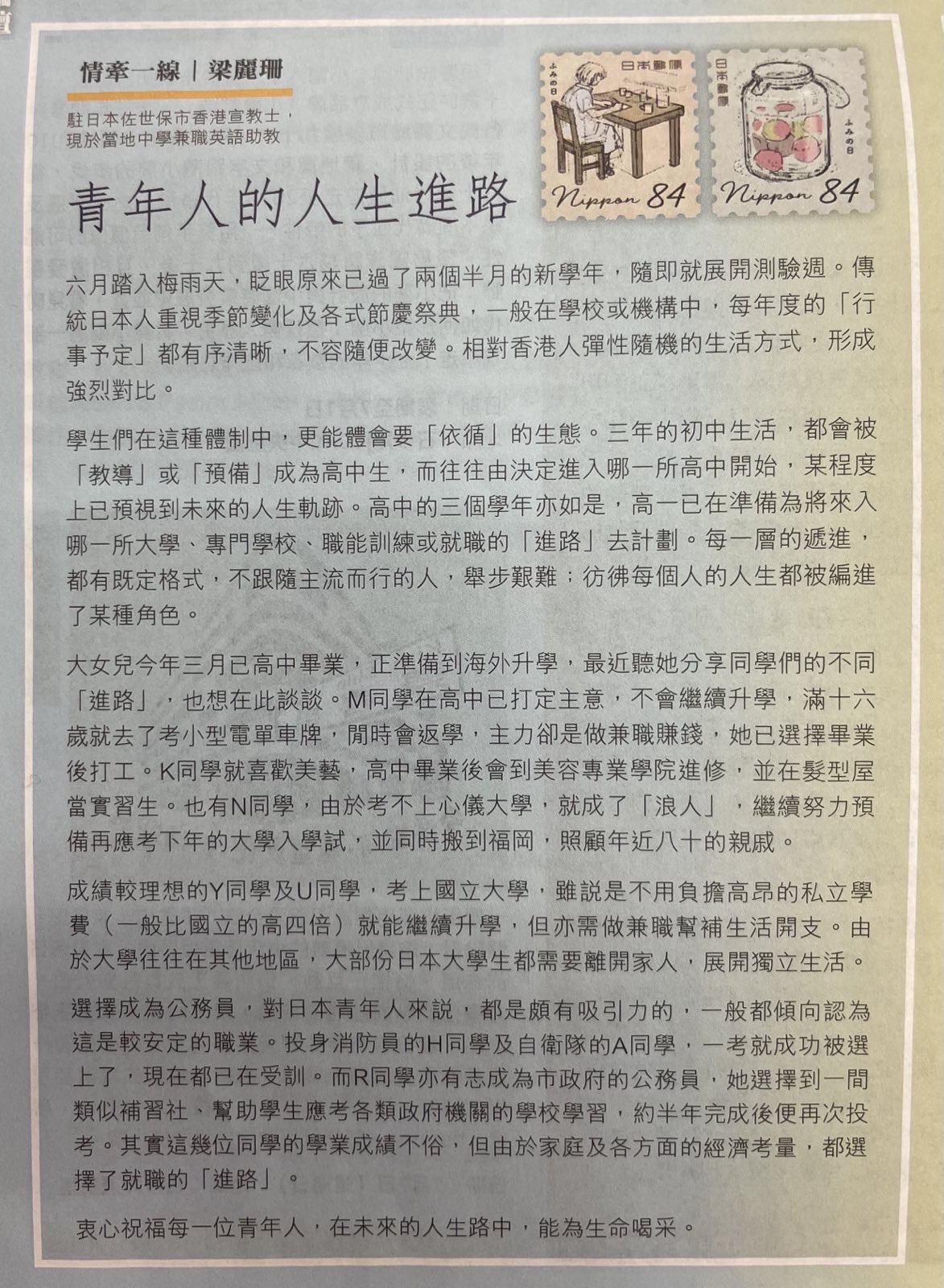 隨筆《青年人的人生進路》 Post author:Lai Shan Leung Post published:2024-07-28 Post category:隨筆 Post comments:0 Comments *本文於《時代論壇》(2024年6月28日)刊登 Views : 7 Tags: 時代論壇 Please Share This Share this content Opens in a new window Opens in a new window Opens in a new window Opens in a new window Opens in a new window Opens in a new window Opens in a new window Opens in a new window Opens in a new window Opens in a new window Read more articles Previous Post隨筆《日本人的安全感》Next Post短宣隊的祝福 You Might Also Like 隨筆《日本退休白髮勞動力》 2023-10-08 隨筆《短宣「再」體驗》 2025-03-14 不是宗教・卻是愛 • Not Religion, But Love 2025-08-05 Leave a Reply Cancel replyCommentEnter your name or username to comment Enter your email address to comment Enter your website URL (optional) Save my name, email, and website in this browser for the next time I comment. Δ